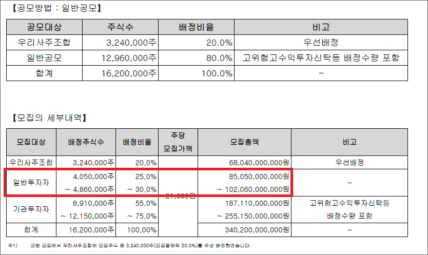 일반공보 수량 1296만 주에서 55.0 ~ 75.0%는 기관투자자에게 배정되고일반투자자들에게는 25.0 ~ 30.0 %인 405만 주 ~ 486만 주가 배정될 예정입니다.