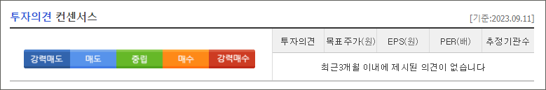 23.9.11일 기준 투자의견은[매수]목표주가 51,500 원입니다. 현재 목표주가 보다 조금 높은 가격인 53,000원대에 거래되고 있습니다.