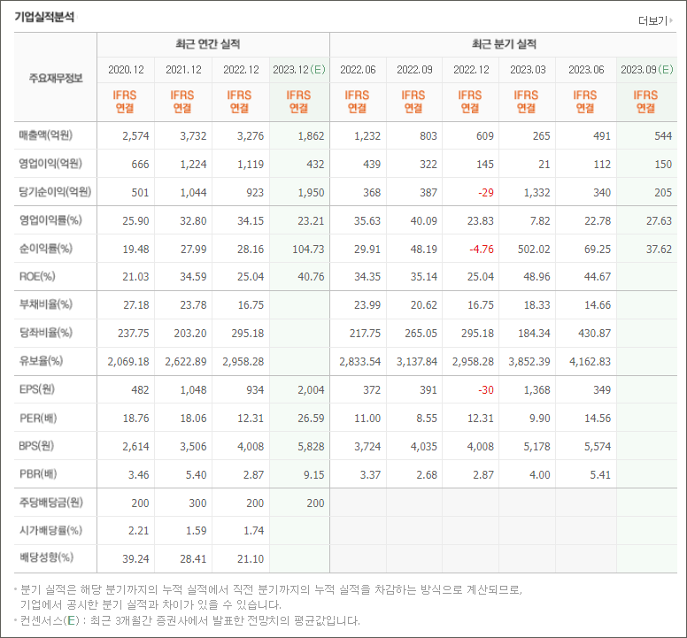 23년 3월 전년동기 대비해서 연결기준매출액 58% 감소, 영업이익 90.2% 감소,당기 순이익 578.7% 증가했습니다. 전년도 동기 대비해서 매출액은 감소했지만 판관비, 인건비, 매출원가 절감 등을 진행했으며, 세전계속사업이익과 이자 수익으로 당기 순이익은 대폭 증가했습니다.